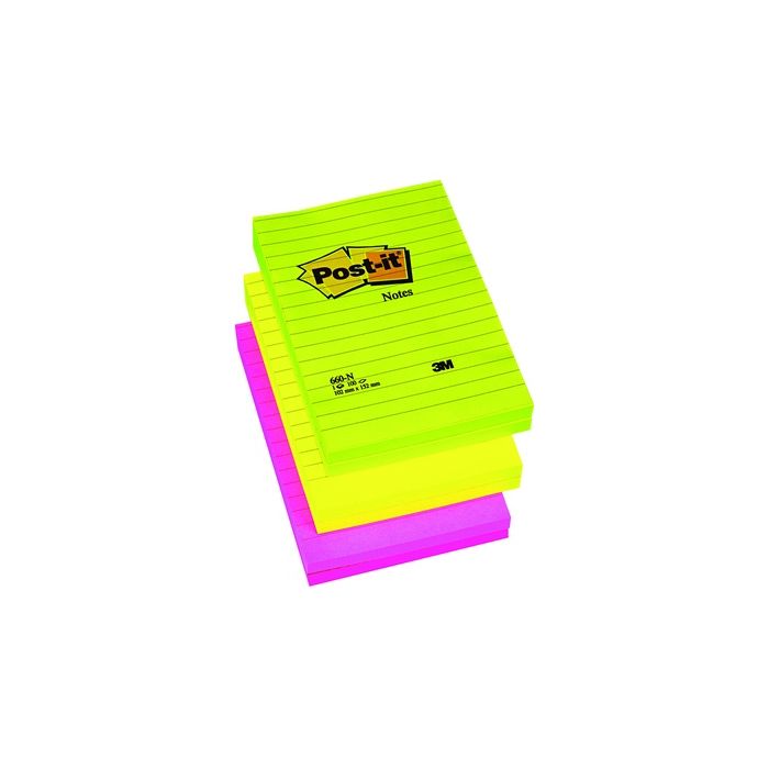 Take detailed notes or create neat lists with Post It Large Notes Neon Colours. Ideal for times when you can't fit your message on to just one Post It Note, these large self sticky notes offer all the space you need for when details are important. They're perfect for organising, taking more notes or leaving longer messages. Made with PEFC certified paper fibres, coming from sustainably managed forests and controlled sources. 100 feint lined sheets per pad. Bright assorted colours. 101mm x 152mm (6 x 4"). Pack 6.