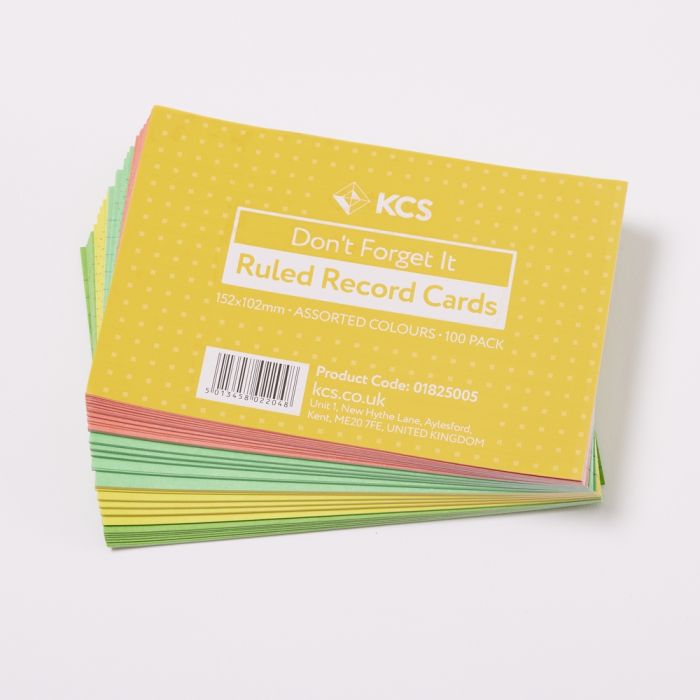 Our KCS Record Cards are 6mm ruled with a headline on both sides. Quality card. 152 x 102mm. Assorted Colours - 25 each of Blue, Pink, Green and Yellow. Save £6 when you buy 5 pads. Single pads are available with code 01825018.