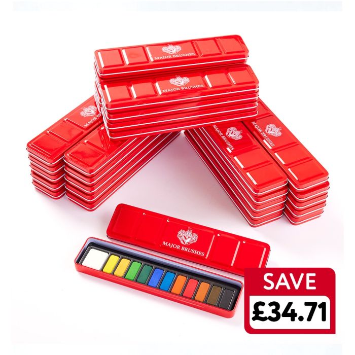 Watercolour tin featuring 12 coloured watercolour tablets. The metal tin ensures durability while remaining easy to store, organize and transport. Crafted with finely ground pigments, each shade offers bold colours and smooth blending. Plus, the lid has a white interior with 5 sections, which are ideal for colour mixing and exploring colour theory. Compact, convenient, and great for students! Colours include; white, crimson, vermillion, gamboge, hookers green, prussian blue, ultramarine, purple, yellow ochre, burnt sienna, vandyke brown and ivory black. Pack of 30 tins.