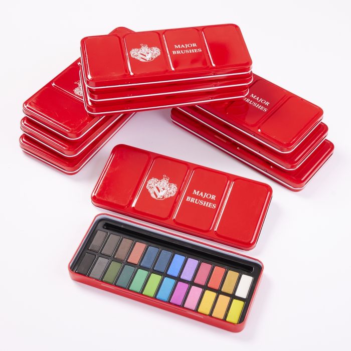 Watercolour tin featuring 24 coloured watercolour tablets. The metal tin ensures durability while remaining easy to store, organize and transport. Crafted with finely ground pigments, each shade offers bold colours and smooth blending. Plus, the lid has a white interior with 4 sections, which are ideal for colour mixing and exploring colour theory. Compact, convenient, and great for students! Colours include; Lemon Yellow, Peach Orange, Gamboge Hue, Rose, Purple, Turquoise, Leaf Green, Emerald Green, Forest Green, Olive Drab, Battleship Grey, Black, White, Yellow Ochre, Red Orange, Crimson, Violet, Marine Blue, Midnight Blue, Burnt Sienna, Russet Brown, Dark Brown.. Brushes not included. Pack of 10 tins.