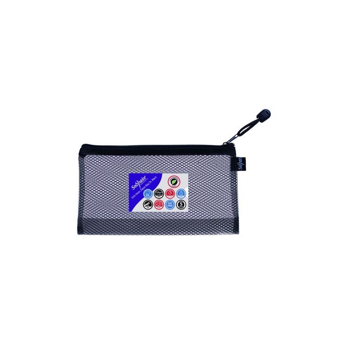 Keep belongings secure and organised with the Snopake EVA Black Mesh Zippa Bag. Made from 350-micron reinforced heavy-duty mesh, this DL-sized 240x130mm bag is flexible, recyclable, and PVC-free. Its wipe-clean, water-resistant material ensures durability, while the top zip with metal pull and front cardholder offers easy access and personalisation. Perfect as a pencil case, it also features a 5-year guarantee for added peace of mind.
