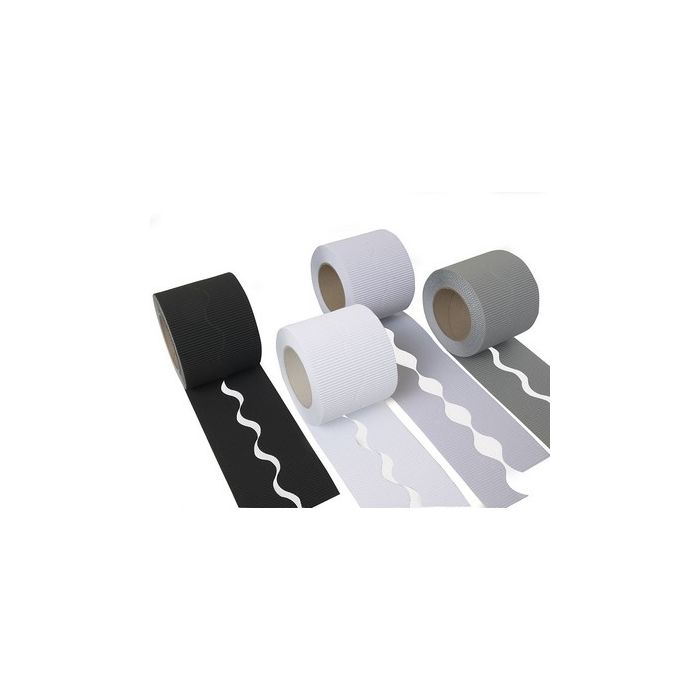 Pre-cut corrugated border roll, 1 each of black, white, grey and silver. 57mm x15m. Pack 4