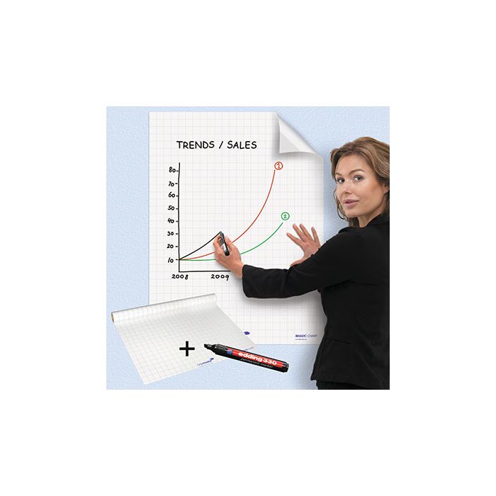 A1 magic whiteboard sheets create an instant writing surface so you can be prepared for anything. Erasable when used with a whiteboard marker or use permanent markers for a more intensive ink colour (longer drying time). No adhesive required and leaves no trace. Electrostatic foil easily sticks to almost any surface (wood, concrete, glass, wallpaper etc.). Re-positionable. Environmentally friendly. Roll width 60cm, perforations every 80cm. White foil, glossy look. Including one board marker. Gridded. Pack 25 sheets.