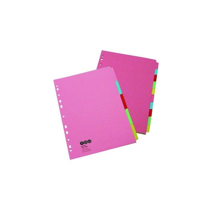 Assorted colour A4 divider sets for everyday filing and indexing. 155gsm manilla card. Europunched. Extra wide dividers ideal for use with A4 Punched Pockets. 245 x 295mm. 10 Part Set. Each.