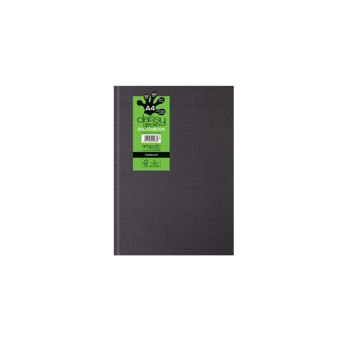 Classy Gecko casebound sketchbook features a soft touch, hardback laminated black cover. Contains 46 sheets / 92 pages of superior all media 150gsm toothy cartridge paper. A4. Portrait. Each.