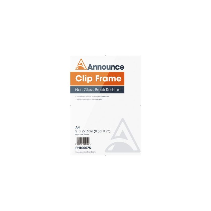 Display photos, certificates, and posters securely with the Clip Frame in A4. Designed with a break-resistant styrene front and a durable hardboard back, these A4 clip frames are both practical and safe for educational environments. Metal clips hold contents firmly in place while preventing surface scratches. Suitable for both portrait and landscape display, they are ideal for classrooms and offices. Dimensions: W214 x D355 x H302mm.