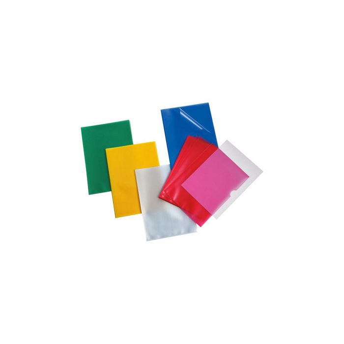 A4 multiuse top and side opening folders. Thumb hole for easy opening. 105 micron PVC folder, strong enough to withstand heavy use. Assorted colours - 5 each of Green, Yellow, Blue, Red and Clear. Pack 25.