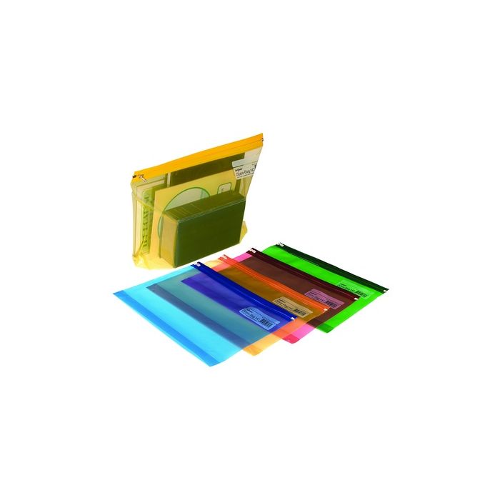 A4+ Zipped Wallets with 60mm gusset, giving 50mm extra capacity. Made from tough, flexible and hardwearing material. Tinted bag co-ordinates with zip-strip. Assorted colours - 5 each of Yellow, Blue, Orange, Red and Green. Pack 25.