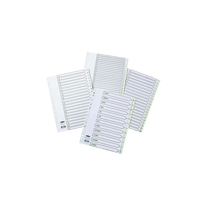 A4 120 micron Polypropylene indexes. Durable, tear and stain resistant. Europunched. Matching paper contents page with Mylar reinforced spine. White indexes with multi-coloured reinforced tabs with numbers 1-10 in clear black writing. Numbered 1-10 Set.