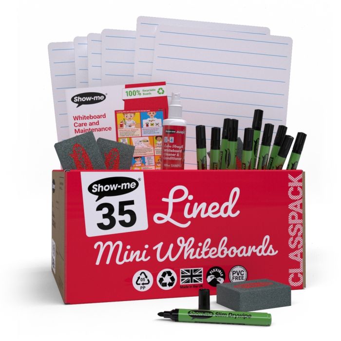 Show-me Classpack of A4 Lined/Plain Whiteboards, with 35 sets. Each set has 1 board, pen and eraser plus 2 free cleaners and a helpful guide to get the most out of your whiteboards. A classroom favourite for over 20 years, with an even better surface than ever before; Built in anti-microbial protection. Patented StayClean technology. Made from PP rather than PVC. Fully recyclable; in your usual recycling bin. Market leading 2-year surface guarantee.