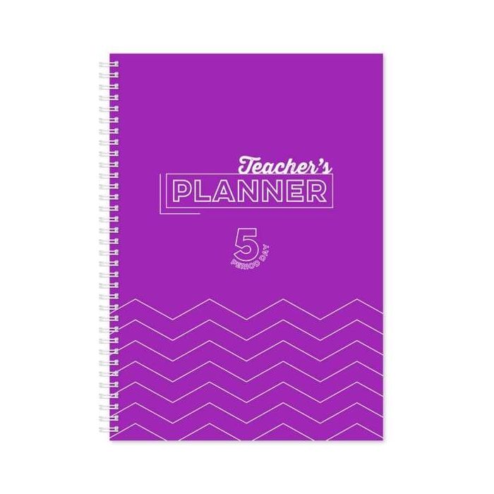 Details section for duties, meetings, events, activities, exams, tutor groups, expenses and purchasing. Planner and calendar - 204 undated teaching day planner pages with additional space for homework, notes and activities. Grades section for 40 names plus a summary of each term. Fold out academic planner with world map. Purple Cover. Each