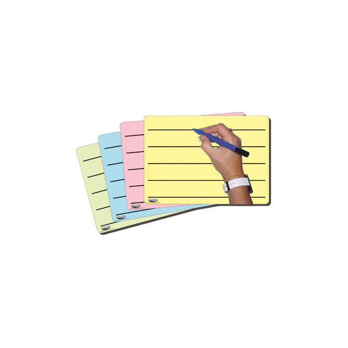These double-sided, rigid fibre drywipe boards are designed to support children who suffer with visual stress. Lined on one side and plain on reverse. 3.6mm thickness. Each set includes a Blue, Green, Pink and Yellow tinted board. Pack of 4.