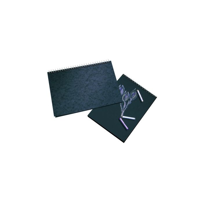 Wire bound sketchbook containing 92 pages/ 46 leaves of 160gsm high quality white cartridge paper. Large ring bind. Hardback. Black Cover. A4.
