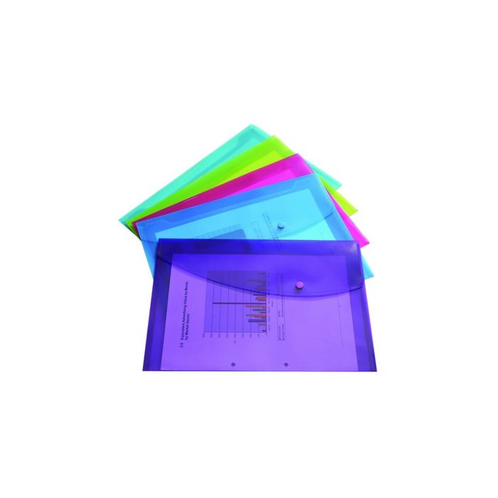 Tough and durable landscape popper wallets. Strong Transparent Polypropylene. Foldover flap with press stud fastening. Assorted Bright colours - Red, Green, Blue, Dark Blue and Purple. A5. Pack 5.