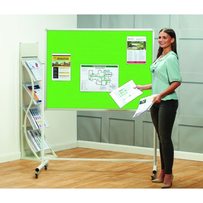 Double sided mobile noticeboard, satin silver aluminium frame with a felt fabric cover. Mobile stand with locking castors and stability bar, height adjustable by 210mm. panels are free standing and can be butted together, easy to assemble. Delivery of this product will be to kerbside only. You will need to arrange for the product to be moved to its final location.