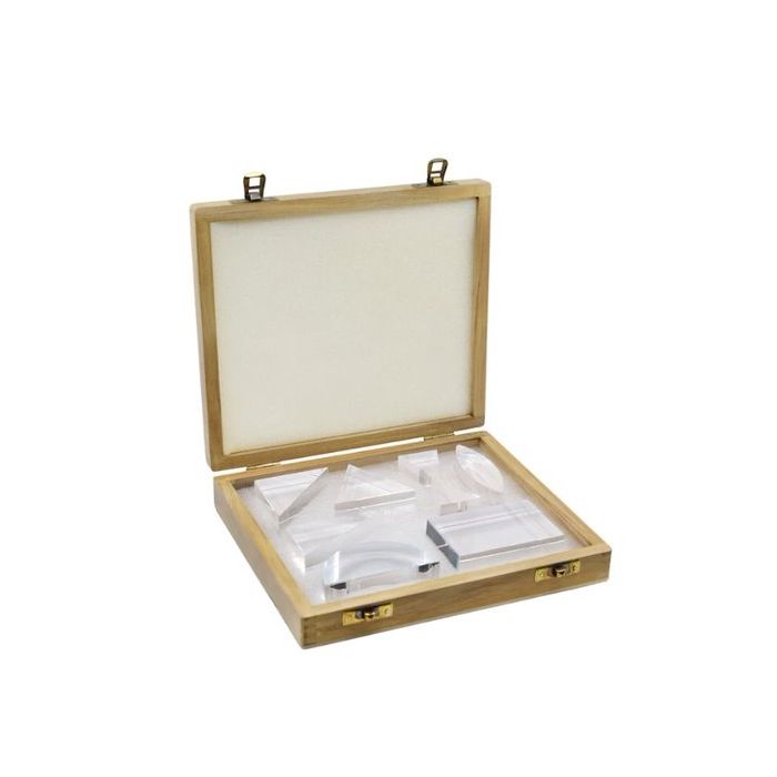 Consists of 7 blocks, all faces fully polished, 25mm thick. Rectangle: 75 x 50mm. Semi-circular: 75mm dia. Triangle: 60 x 60 x 60 degrees with 58mm side. Triangle: 90 x 45 x 45 degrees with 75mm hypotenuse. Triangle: 90 x 60 x 30 degrees with 75mm hypotenuse. Bi-convex: 75mm long curved faces, 100mm radius. Bi-concave: 75mm long curved faces, 100mm radius.