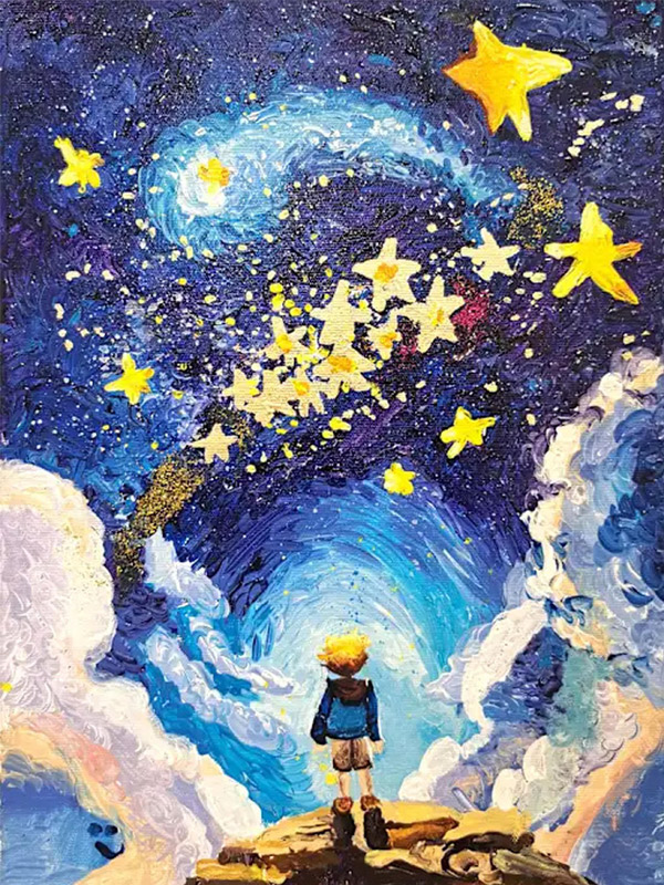 Ioan Mikael Nedelcu’s enchanting painting captures the wonder of childhood imagination, a young dreamer gazes into a swirling galaxy of stars, inviting us to see the universe through eyes full of curiosity and hope.