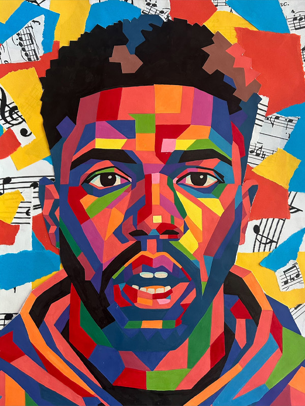 A vibrant portrait bursting with rhythm and energy, Brooke Mason’s piece layers bold geometric colour blocks over musical motifs, a joyful fusion of sound and self-expression.