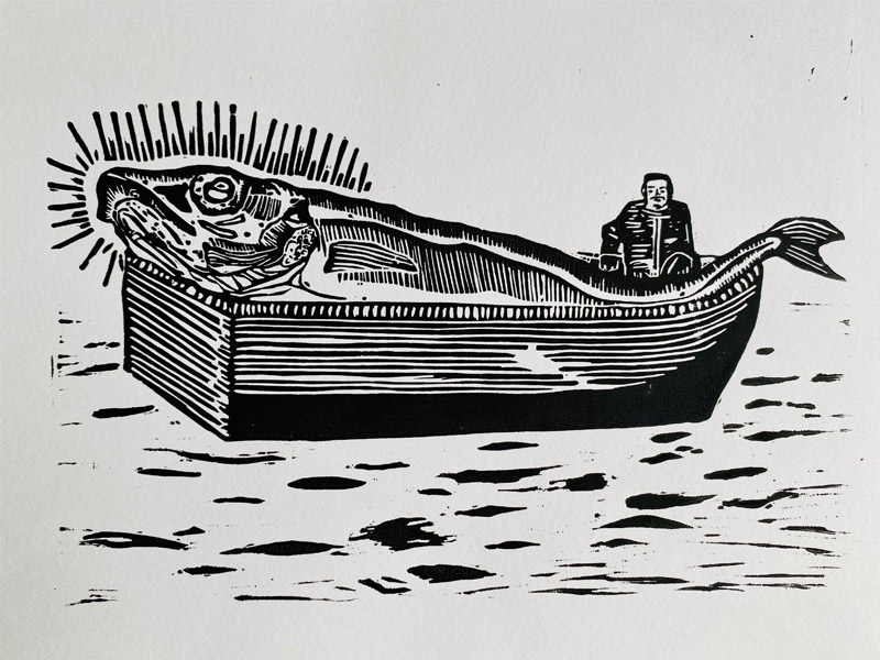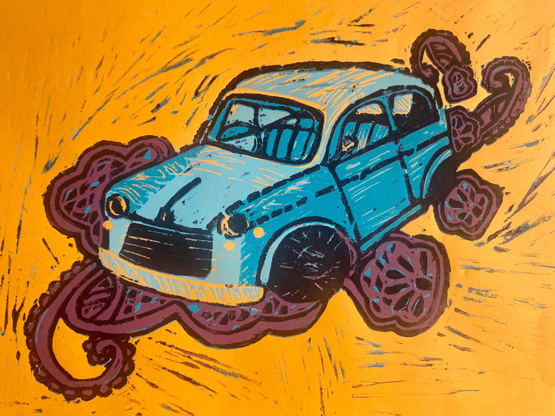 Together, Oria and Liepa Stomaite Palomino’s prints explore movement and imagination through bold contrasts and surreal storytelling, from a vintage car that seems to soar to a boat carrying a giant fish, their work captures the thrill of adventure and the poetry of the unexpected.