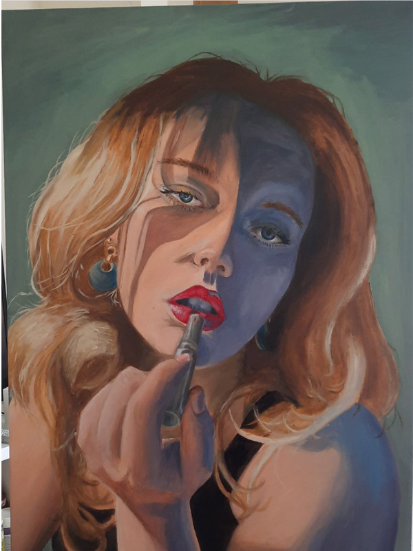 Ella Doubleday’s striking portrait plays with light and shadow to reveal duality, a moment of quiet transformation where beauty, identity, and introspection meet on the edge of a brushstroke.