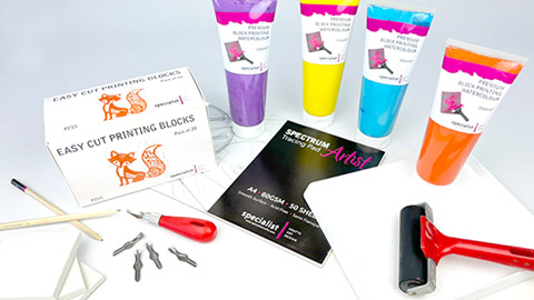 For this technique, you will need easy-cut printing blocks, block printing watercolours, a lino handle and cutter set, tracing paper, painting trays, and paper to print onto.