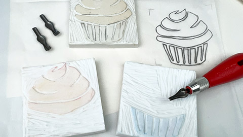 Next, decide which parts of your design to carve out. Carve this using a lino cutter and a range of cutter blades. For this design, we have carved out all of the background to leave the outline of the cupcake. Remember, your design will also be mirrored when printed!
