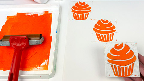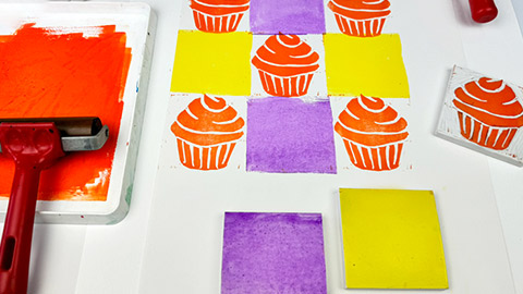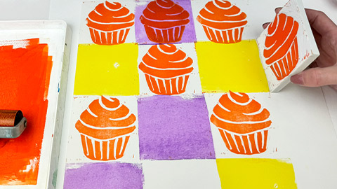 If you opted for multiple printing blocks for your design, ink the blocks in the desired ink colours. Starting with the top of the cupcake, print this on top of the background by lining up the square edges again. Take the bottom of the cupcake, then print it on top, ensuring it is also aligned to the background