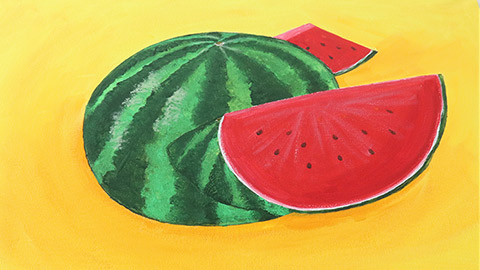 With a thin brush and white paint, paint a thin line above the watermelon skin. Then, using a mixture of red paints, paint the watermelon flesh. Once dry, lightly use a foam brush dipped in white paint to create detailing on the melon.