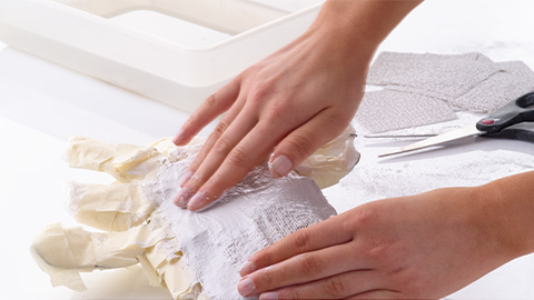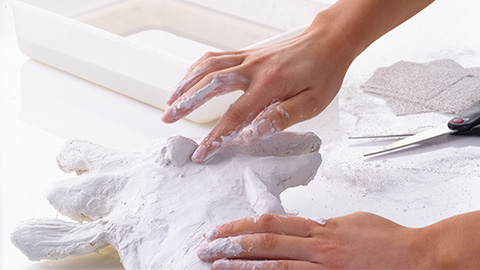 Whilst the Mod Roc is still damp, rub the surface gently using wet fingers as this will encourage the plaster to come to the surface of the cloth gauze and allow you to create a smooth surface. Each time you add a strip of Mod Roc, repeat this process. One or two layers will be enough to cover an object, but to obtain a rigid structure you should use a minimum of three or four layers.