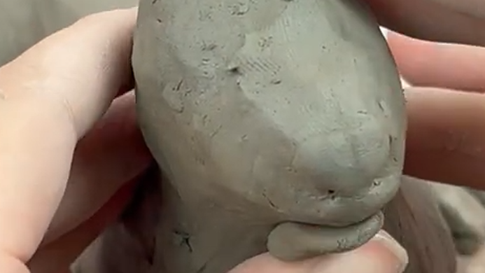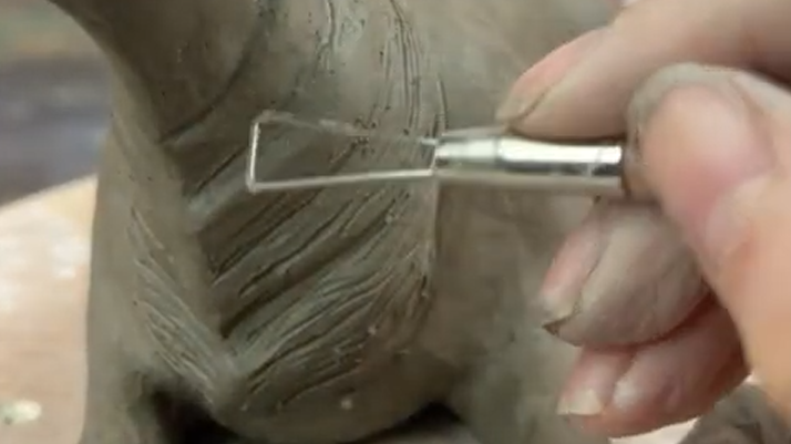 Create a small hole on the underside of the sculpture to allow air to escape during firing. Continue building up fur texture with small additions of clay, ensuring the texture wraps fully around the body and reads as three-dimensional.