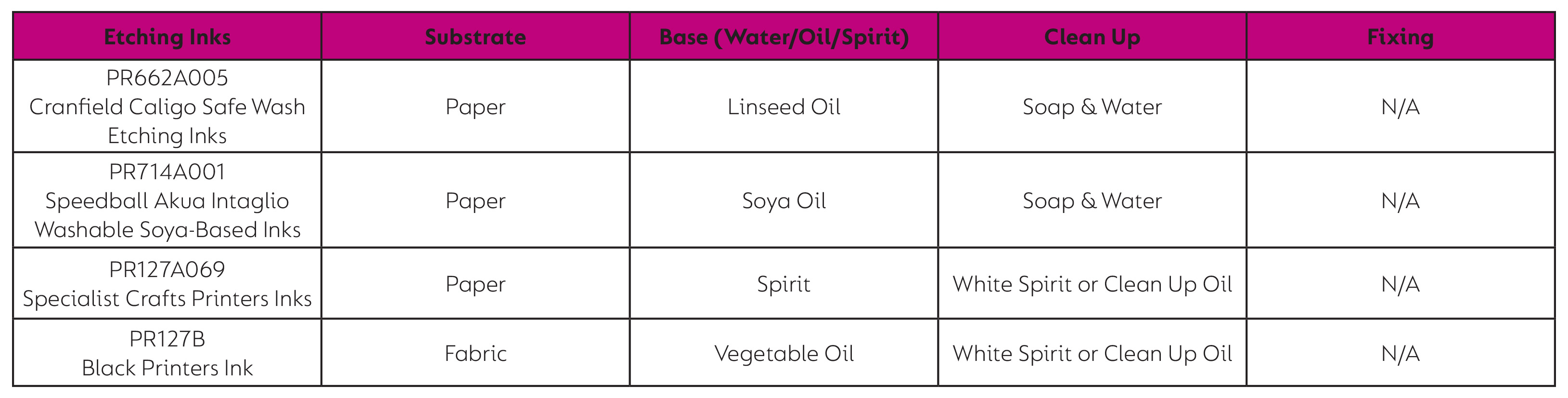 Etching inks need to be a certain consistency for them to be coaxed into etched lines. Equally, they then have to be wiped off areas which do not require printing. The best inks for this task are oil-based, but note that some are easier to clean up than others. Choose the right ink from the list below to suit all levels of ability; zinc, acrylic and dry paint. There are many options available on our website to allow etching to be taugh in schools, colleges and print workshops with confidence, and not all require the use of harsh chemicals or solvents.