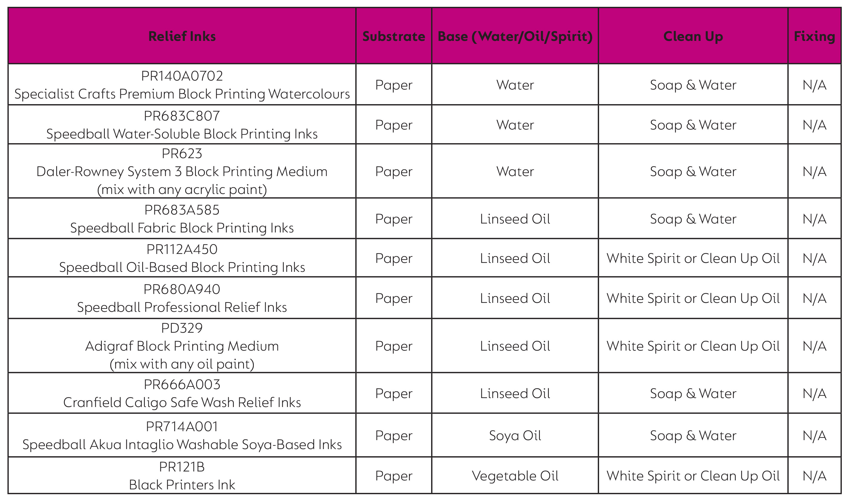 Relief printing is ever popular in schools and workshops and we’ve done our best to make it accessible to everyone with our huge range of lino, lino cutting tools and inking rollers. We also offer QuickPrint, wood blocks and stamps. It’s important to use the right ink; these special Block Printing Inks are slightly tacky in their nature, so when they’re applied to the carved block with a roller, they will stick to the smooth, raised surface without flowing into the carved lines. This ensures a crisply defined, dense and even print.