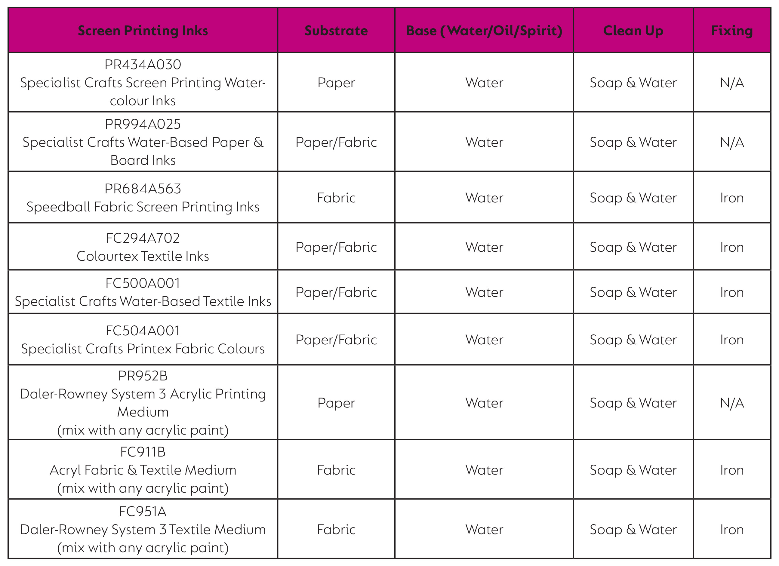 Use the table below to help you choose the best ink for your project.