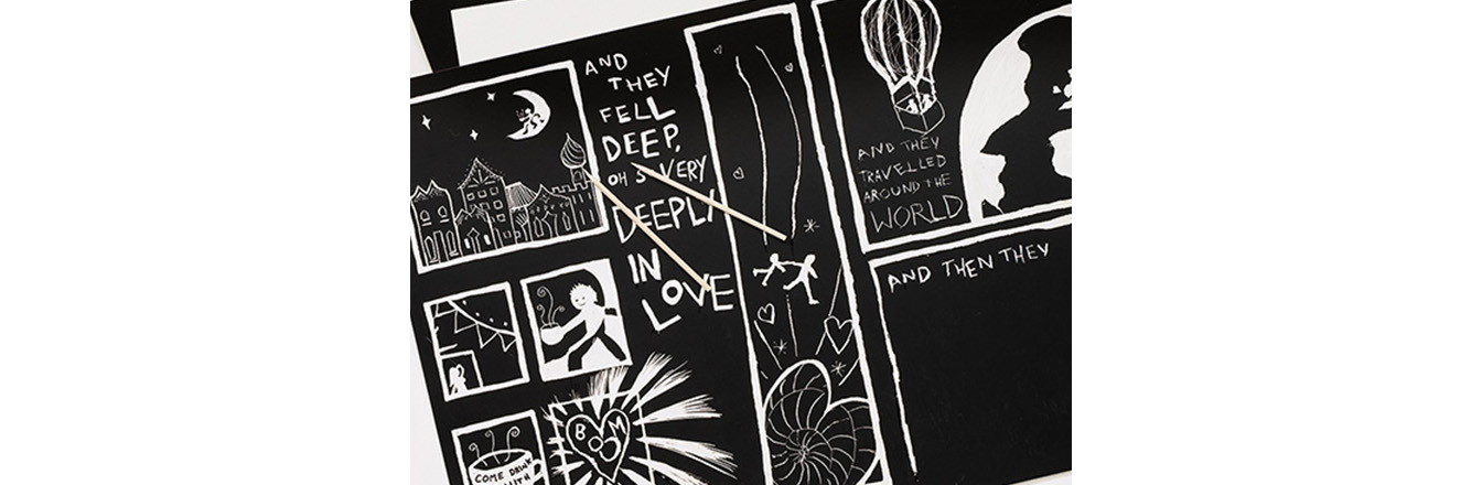 Another way of adding colour is to use multicoloured scratch paper or scratch light film which, when scratched away, expose the transparent and blended colours beneath. Once designs are completed, they can be displayed as window decorations or combined with internal lighting, and the designs will ‘glow’.
