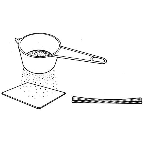 Place the metal blank on a clean sheet of paper. Pour a small quantity of enamel powder into the sieve. Holding the sieve over the outer edges of the blank, gently tap the side so that a layer of powder, approximately 3/4 the thickness of the blank falls onto the surface. Ensure that the powder lies deepest at the edges. Slip a palette knife under the metal piece and lift it onto the panning mesh (firing support).