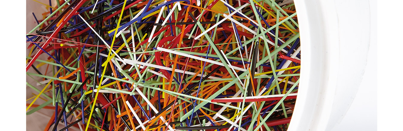 Threads are thin rods of enamel colours, available in opaque and transparent colours. which can be used for linear designs. Using tweezers, the threads can either be placed on the enamel powder prior to firing, or the fired enamel coated with Tramil (water-based gum) and the threads applied dried and refired.