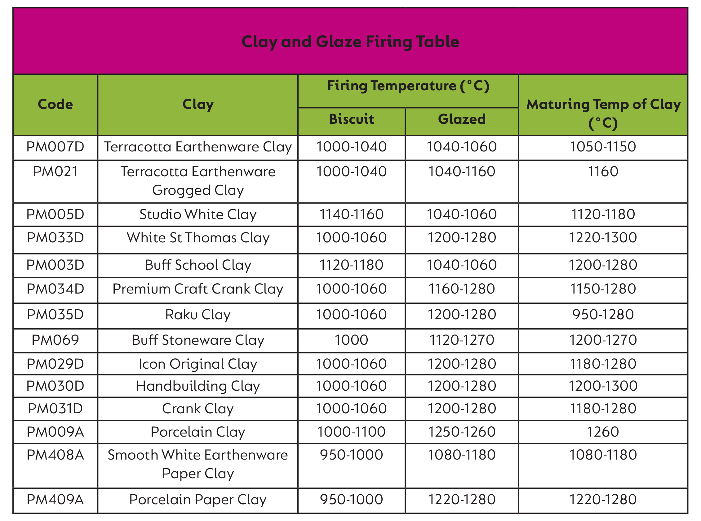 - Use the chart below to help you fire your biscuit and glazed pieces at the right temperature.