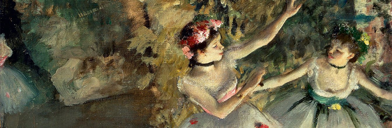 Read the writing below. Tell them that the opening sentences broadly describe the artwork. Then it goes into more detail and then it describes the mood/atmosphere of the artwork.The painting shows two ballerinas standing, facing each other. The artwork looks like an unfinished sketch. Degas has used dark browns and sepia colours and the paint has been applied in both dark lines and dry brush marks. There is lots of quality of line and mark making within the artwork and the flowing lines sometimes fade so that parts of the picture are only implied. The mark making helps describe the layers of the ballerina’s skirt and fluffy material at the shoulder of the right-hand ballerina. The faces of both ballerinas are very dark. On the left-hand ballerina, you can just see some hints of the features of the face, whilst the profile of the ballerina on the right is almost completely silhouetted, save for some detail in the hair. The mottled effect of the paper has probably come with age. The atmosphere of the artwork is intimate as if we are watching a private moment in time.