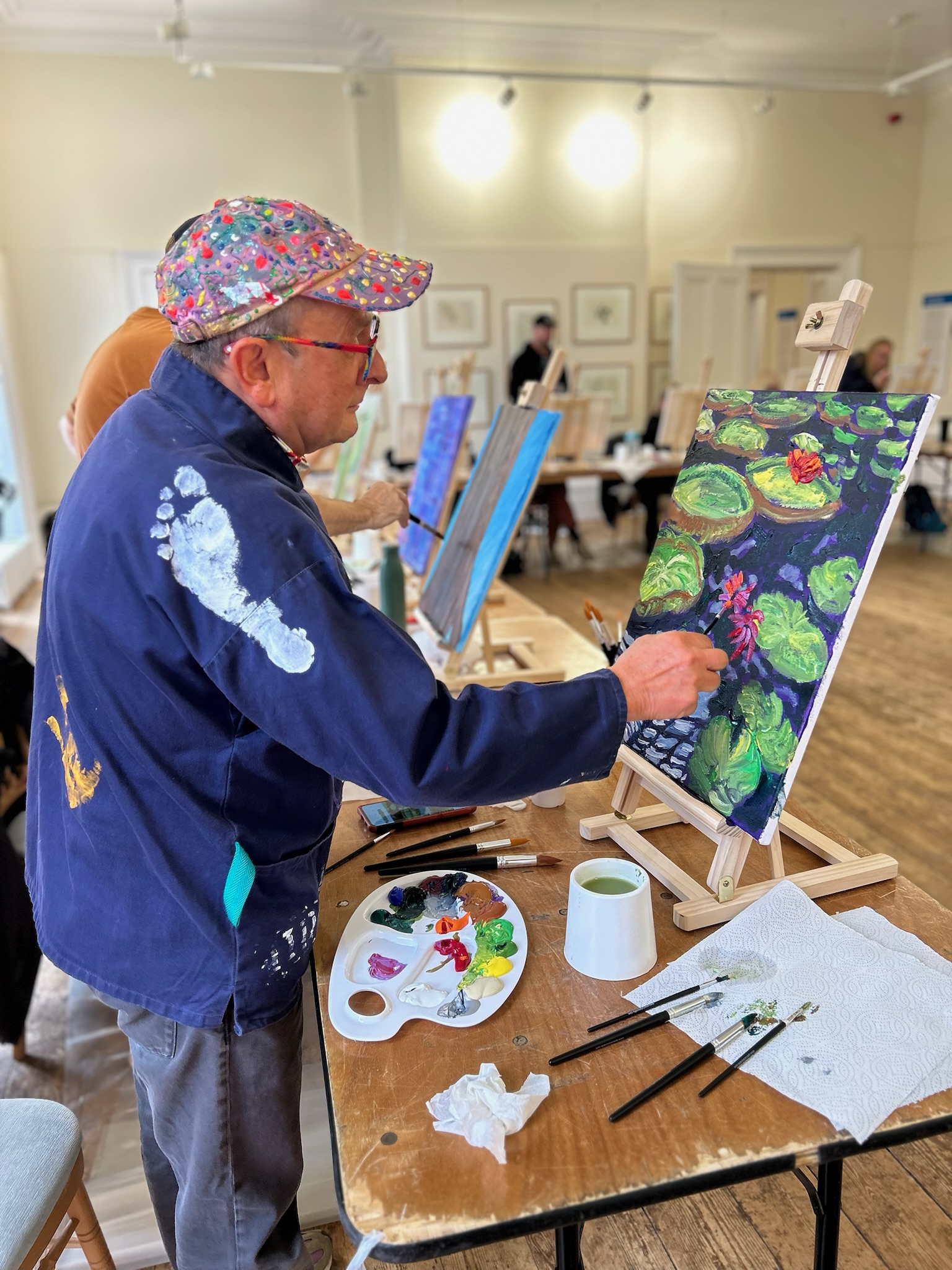 After lunch, everyone returned to their canvases with renewed energy to put the finishing touches on their paintings. The room was alive with creativity and focus. Once complete, the artworks were proudly displayed for the group. Timmy moved around, offering thoughtful and enthusiastic critiques, highlighting details that made each piece unique. His encouraging feedback inspired everyone to see their work in a fresh and exciting way.