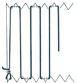 Method 2: Loop the warp threads around the serrations, resulting in vertical threads running down the front of the card, and small loops over the serrations on the back of the card. Again, loose ends can be secured onto the back of the card with sticky tape.