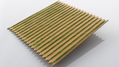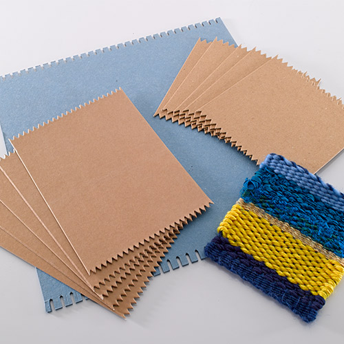 Serrated card looms feature evenly spaced serrations to assist in winding the warp thread onto the loom. These cards do not play an integral part in the finished fabric, and therefore can be removed and reused again and again.