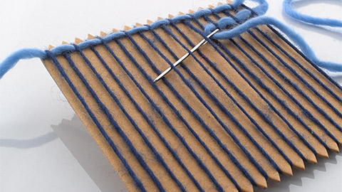 Cut a length of yarn and thread the yarn through a needle. You’ll be using the needle to guide the yarn through the loom in an under-over pattern. (Under the first string, over the second, under the next, etc.) until the needle has passed through all of the strings. Pull the yarn through and leave a tail of around 10cm at the end.