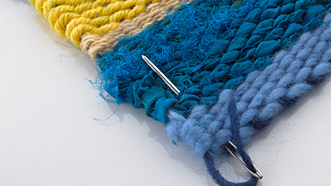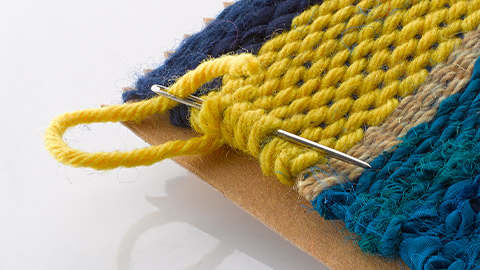 • Following the direction of the warp, insert the needle down along the edge of the weaving, in between the weft threads.