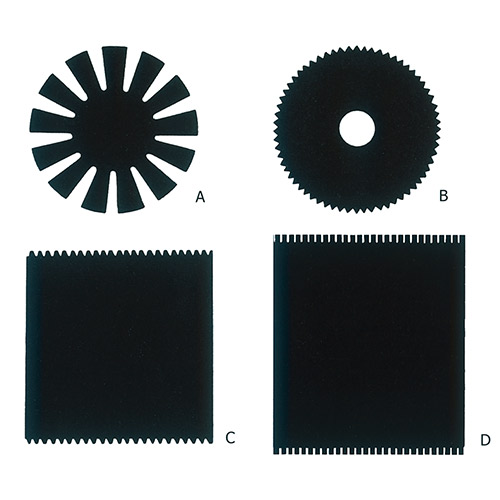 Square and Oblong Serrated Cards, (C), are similar to the round serrated cards, but the use of the warp can be extended to give a greater range of colour texture and pattern. 12 serrations per 10cm.