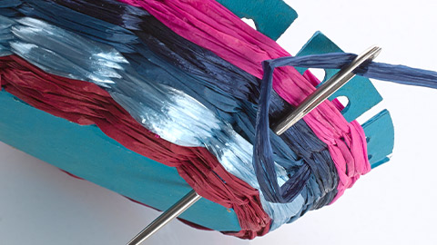 Next, neaten up all of those yarn ends that are sticking out of our basket. Using a tapestry needle to tuck these away inside the weaving:
