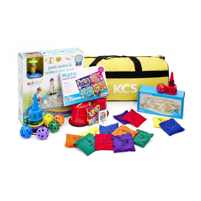 This contains stilts, a pack of 6 katch cups, snakes and ladders game, UNO cards, playing cards pack, wooden dominoes, four maths board games, a pack of 12 animal bean bags and a KCS multipurpose holdall bag. Contents may vary.