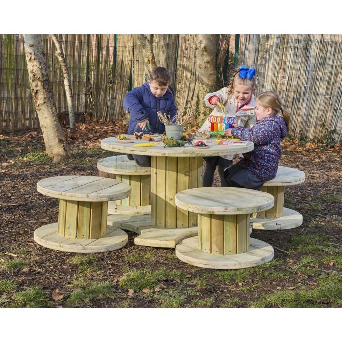 This industrial-style Cable Drum Table and Stools would be a rugged and playful addition to your outdoor space. Crafted from treated timbers to look like a cable drum, this unique set infuses an industrial ambiance into any outdoor classroom, offering a striking and functional furniture solution. With its raw and sturdy design, the Cable Drum Table and Stools exude urban charm with functionality adding a touch of industrial character. L800 x D800 x H800mm.