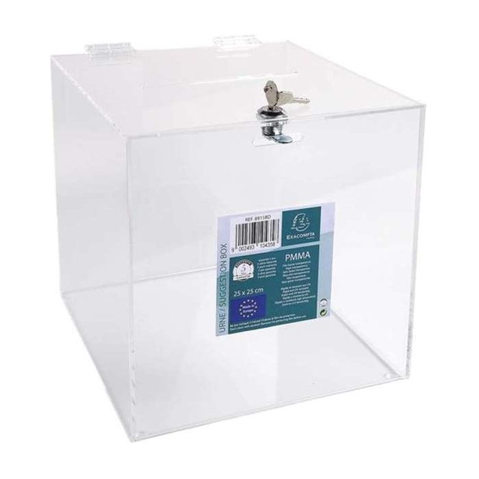 Exacompta Transparent Suggestion Box with Lockable Lid (25 x 25 x 25cm, Crystal Clear) is ideal for competitions, raffles, elections, or collecting suggestions. Made from premium-quality acrylic (PMMA) with excellent transparency, it features a hinged lockable lid and a 15cm slot for easy insertion of forms or ballots. Manufactured in Europe, it comes with a 5-year guarantee.