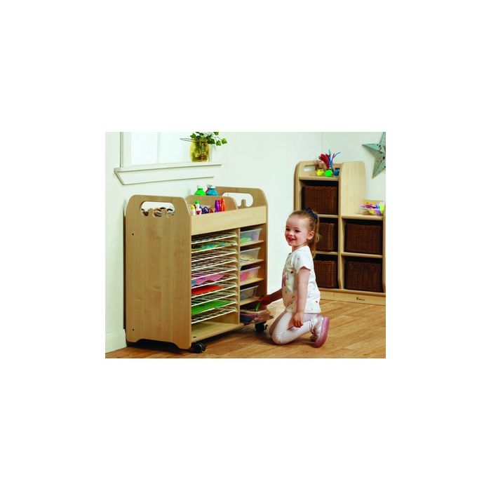 The Combi Art Trolley benefits from a compact yet versatile design - a great solution for pack away settings and smaller spaces. The clear storage trays and containers encourage self-selection whilst the drying racks and paint pots help create a functional space. Features 10 drying racks and 4 paint pots. Lockable castors are anti-scratch and low noise. Supplied fully assembled with a 10 year manufacturer's warranty. W800 x D400 x H800mm. Delivery of this product will be to kerbside only. You will need to arrange for the product to be moved to its final location.