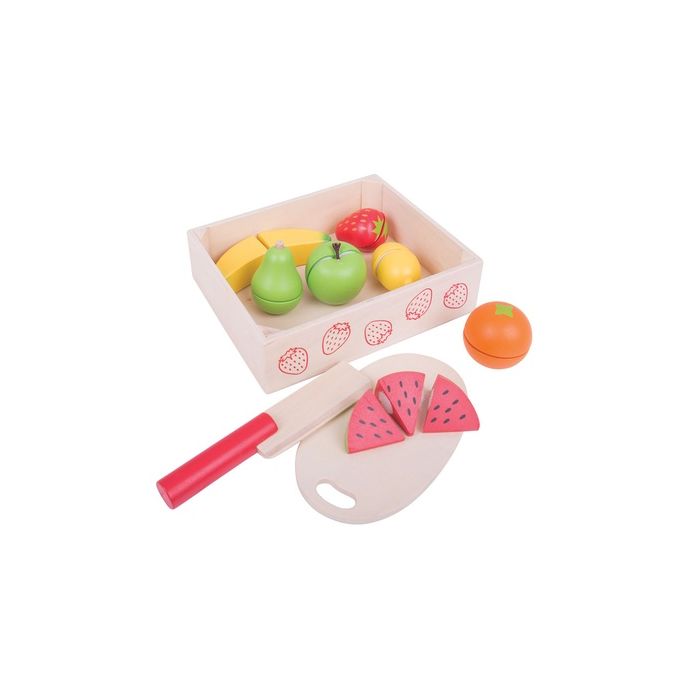 This brightly coloured crate of wooden play food includes a selection of different fruits that can be sliced up carefully and accurately with the aid of a wooden knife. Ensuring complete safety, your little one can chop the fruit up on the supplied wooden chopping board. Includes; apple, pear, orange, lemon, strawberry, banana and melon. 18m+